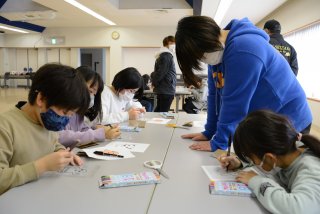 ユースリーダーの手ほどきでプラバン作りに取り組む児童