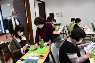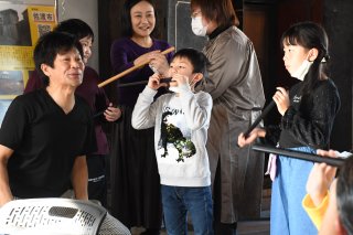 篠笛奏者の狩野さん(左)が音の出し方を指導。子どもたちにもイメージしやすい言葉でこつを伝授した