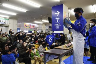 海洋高食品研究部による寒ブリの解体ショー。大勢の観衆の前で、9キロのブリをさばいた