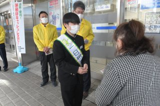 感謝状を贈られるセブン―イレブン上越名立店の藤永さん(中央)と大門店長(9日撮影)
