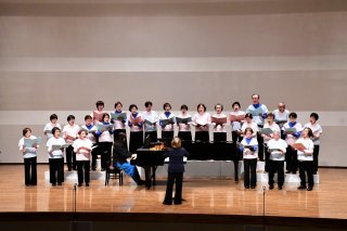 無観客で開かれた「童謡・唱歌を歌う会」のコンサート。全員合唱する参加会員(ビーチホールまがたま)