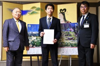米田市長、井川副市長(右)の激励を受けて大糸線の地域おこし協力隊に着任した西山さん