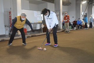 上越ゲートボール連盟の浅野潔会長らから手ほどきを受け、初めて実戦に参加する木村さん