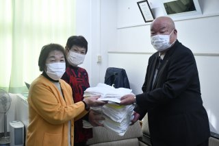 加藤会長(左)から釜田理事長へ寄付が贈られた