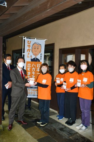 全国大会に出場するバレーボール部メンバーを激励する小林会長(左)