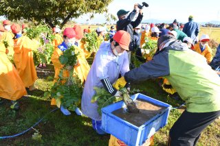 引き抜いた大根を洗ってもらい、持ち帰る2年生