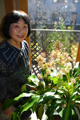 12年ぶりに花を咲かせた「幸福の木」と進藤さん。開花、本紙の取材とも3回目となった(9日、進藤さん宅で)