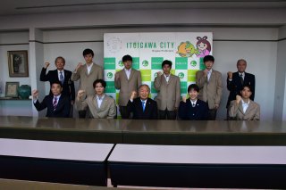 春の高校バレーに出場する糸魚川市出身の7選手の激励会(11月26日、糸魚川市役所庁議室)