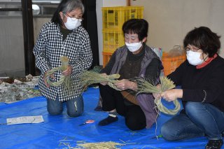 わらを束ね、輪の形のリースを作った