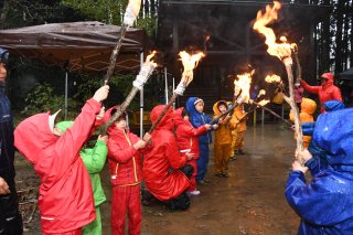 年長児(右)から年中児へ、たいまつの炎が移される。森のリーダーの引き継ぎの意味を込めた