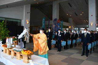 センターハウスで行われた安全祈願祭。スキー場関係者の他、上越市の中川幹太市長や行政、地元関係者らが出席してシーズン中の安全を願った