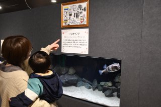 イシガキフグの「ハイちゃん」。さかなクンのイラストも展示されている