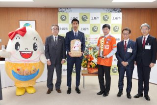 マスクを外して記念撮影に応じる瀬口選手(中央)ら。中川市長はアルビレックス新潟のユニフォーム姿で出迎えた