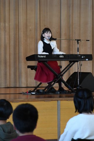 大潟、頸城両区の小学6年生に歌声を披露する佐藤さん