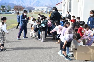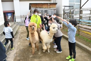 手でアーチをつくって2頭のアルパカを見送る1年生