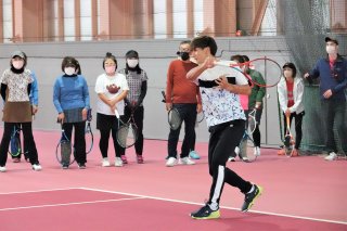 テニスクリニックで実演を交えて技術指導を行う島袋選手(中央)