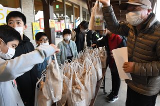 店頭で自分たちが育てた「きずな米」を販売。パッケージは児童それぞれが手掛けたため、子や孫のパッケージを探す保護者も
