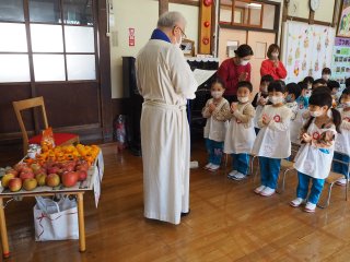 色鮮やかな果物や野菜をささげて礼拝する園児たち