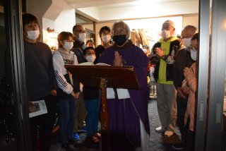 点灯式で祈りをささげる伊能神父