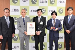 棚田などの傾斜地専用親子式草刈り機「KHM400W(ベローン)」のグッドデザイン賞受賞を中川市長に報告した荻原社長(左から2人目)ら