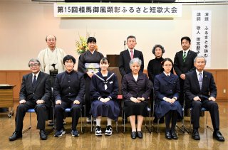 表彰式に出席した一般の部、児童生徒の部の最優秀賞「御風賞」と優秀賞の受賞者、選者ら