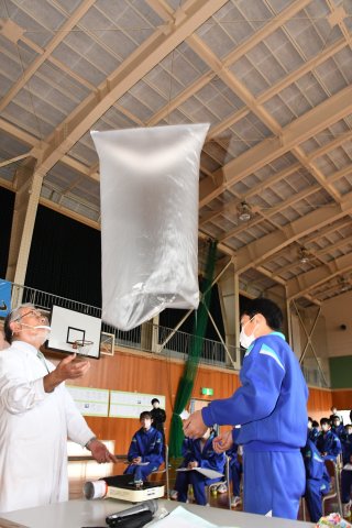 熱気球と同じ原理で、暖めた空気をためたポリ袋を高く浮かべる。温度で気体の体積が増え、密度が小さくなることを示した