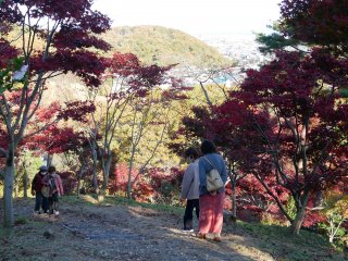 平日は静かなたたずまいの園内。見物客が晩秋の紅葉と散策を楽しむ(18日)