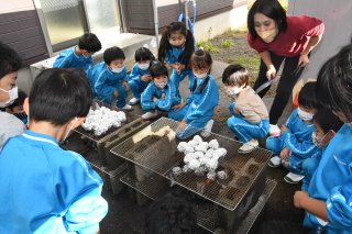 炭火でじっくり焼き上げる様子を見学する園児たち。炭がはぜる音に聞き入った