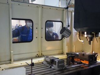 マシニングセンタでキーホルダーに文字が刻まれる様子を見学