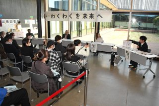 オーレンプラザロビーで開かれたシンポジウム。上越高2年の髙橋君(右)は好きから学びが広がっていくと語った