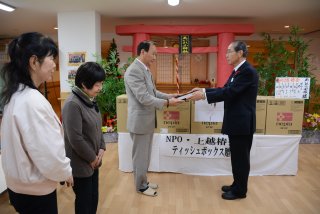 上越椿会がティッシュボックス300箱を寄付。太田施設長から椿代表(左)に感謝状が手渡された