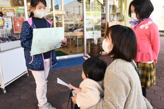 児童が商店街の店頭でクイズや動画上映を行い、魅力を発信