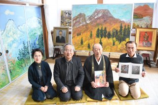 遺作集発行を記念し、多くの作品を公開。(左から)六人の会理事の大西秀子さん、事務局の大西旬さん、佐藤会長、副会長の森田貞一さん(光樹寺で撮影)