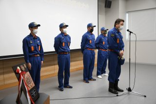 出場者5人が報告会に出席。受賞した盾を前に、関係者への感謝と今後の抱負を述べた