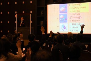 気象に関することわざや気象予報の豆知識などを語った南さん。気象のクイズも出題し、会場も参加した