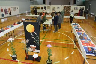 18日の展示作業。「こどものアトリエ」は宇宙をテーマにした立体作品などを出展している