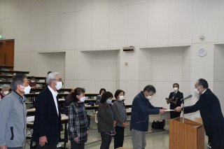 CD・DVDの視聴ができる直江津図書館に大越さん(右から2人目)の朗読が設置された