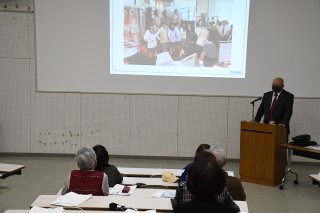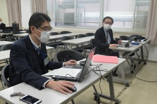 学生に向けオンラインで講義する水沼署長(左)と上越教育大の早川教授