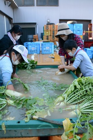 自分たちで収穫した大根を丁寧に水洗いする参加者
