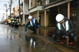 16日の作業の様子。この後もう片方の消雪パイプを起動させ、来た道を戻りながら点検した(上越市仲町4)
