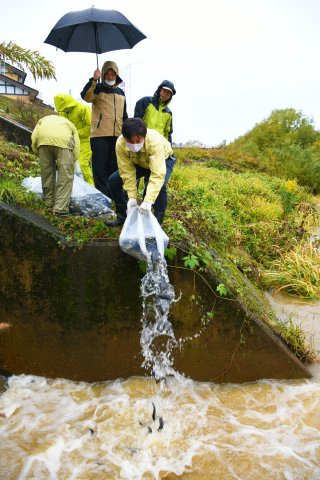 雨の中でコイとフナを放流。大きく育つ3年後に思いをはせた