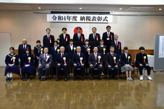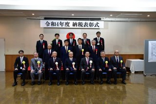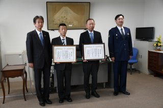 直江津電子工業の小林さん(中央左)、三牧建設工業の三牧社長(同右)が表彰を受けた