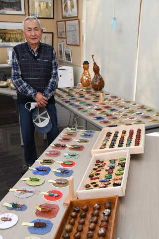 齊京さんと展示作品。竹細工で昆虫などをリアルに再現