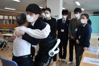 ロボットスーツを装着し、介護の動作を体験した