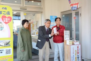 田村店主(右)から浄財を受け取る吉越代表(中央)