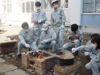 かまどベンチでカレーや焼き芋を調理。普段は木製の座面がふたとなる
