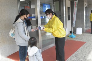 来店客にキャッシュレスでの納税を呼び掛ける税務署職員