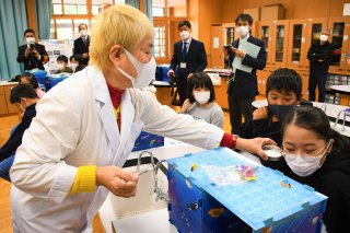上越沖で調査を行ってきた青山さん(左)が講師を担当。児童はメタンハイドレートが燃える様子や溶ける音も聞いた(写真は宝田小5年生の授業)