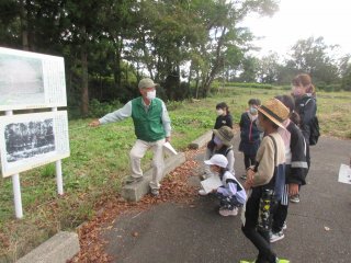 参加親子は2班に分かれ城址見学。保存会の上野会長の解説を聞く参加者