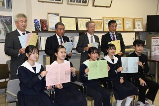 贈呈式での記念撮影(10月31日、新井中校長室)